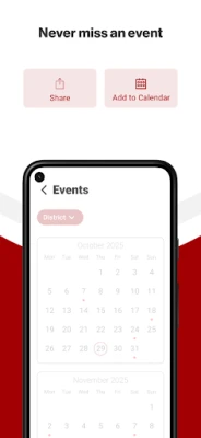 NEVER MISS AN EVENT The event section shows a list of events throughout the district. Users can add an event to their calendar to share the event with friends and family with one tap.