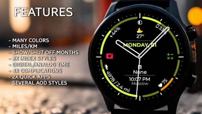 - Select whether to display the distance traveled in miles or kilometers (Select in the watch face settings).