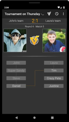 * Just select the tournament type and the players to participate. Once started, you can switch between the tournament overview and the current match(es).