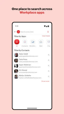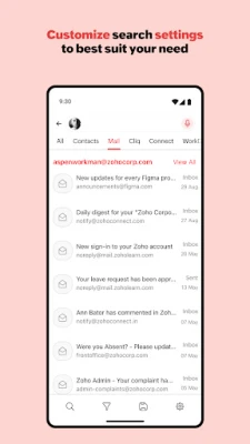 The app offers previews of search results like Connect posts, or WorkDrive files if a quick reference is all you need. You can also save your searches for future use.
